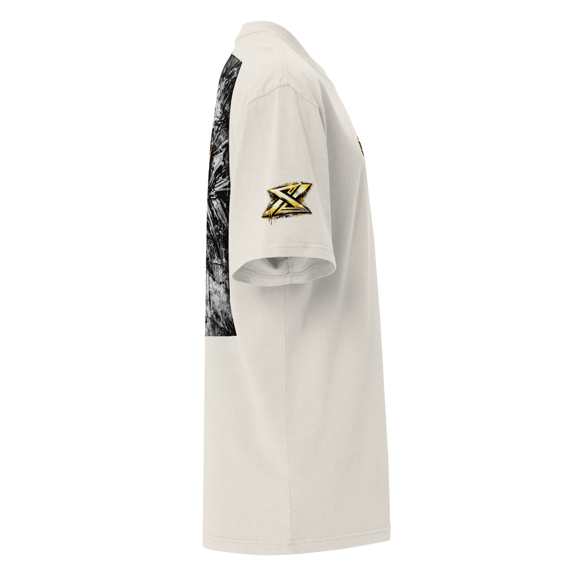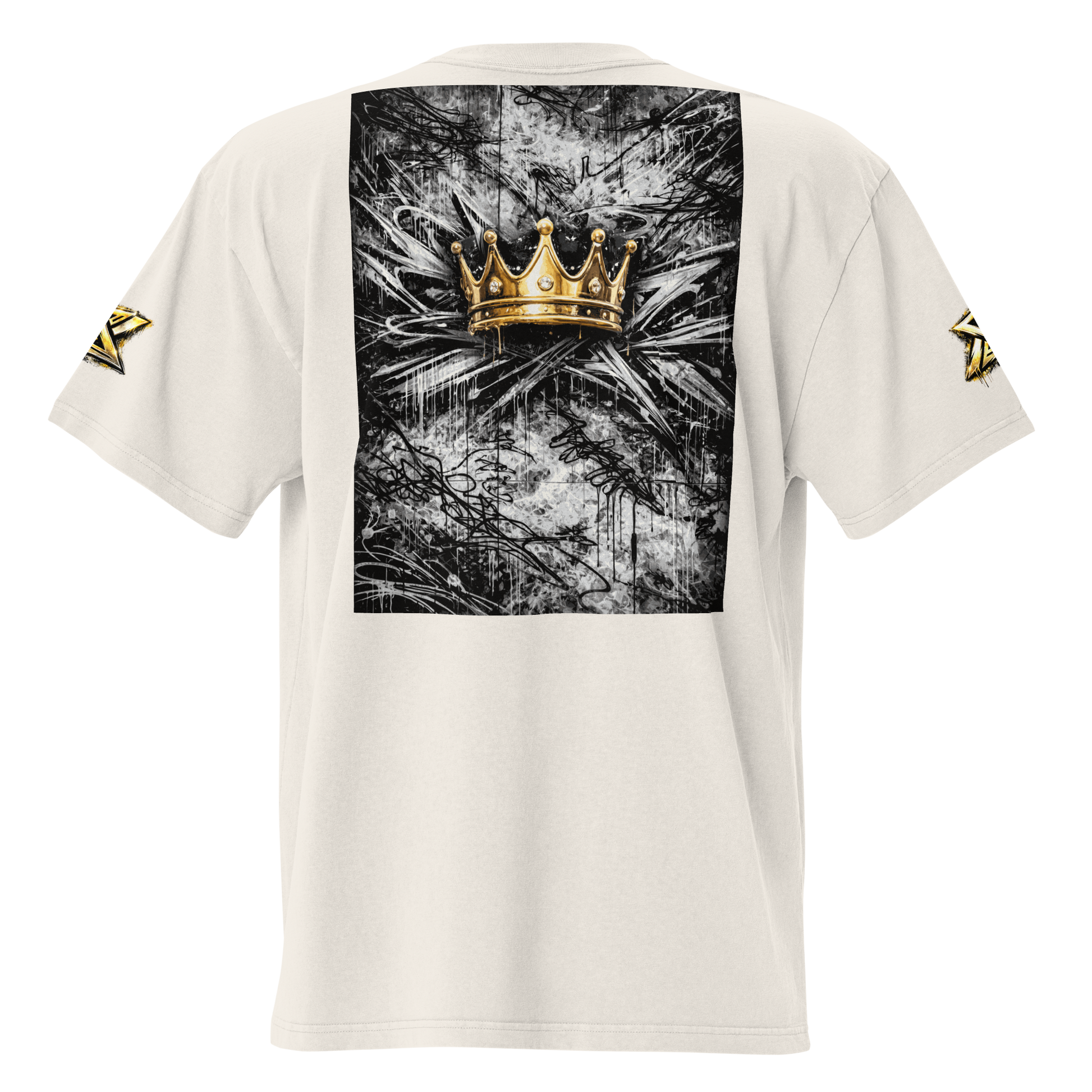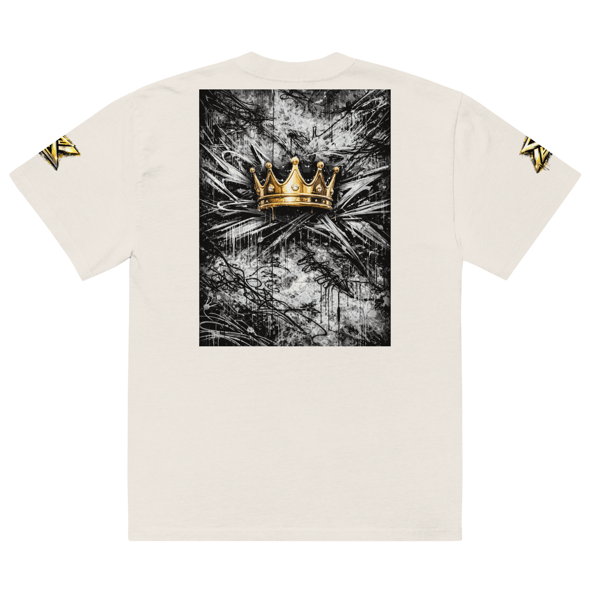 Built on a heavyweight oversized silhouette, this piece carries a layered graphic composition rooted in graffiti culture and symbolic authority. Gold meets light. Structure meets space.