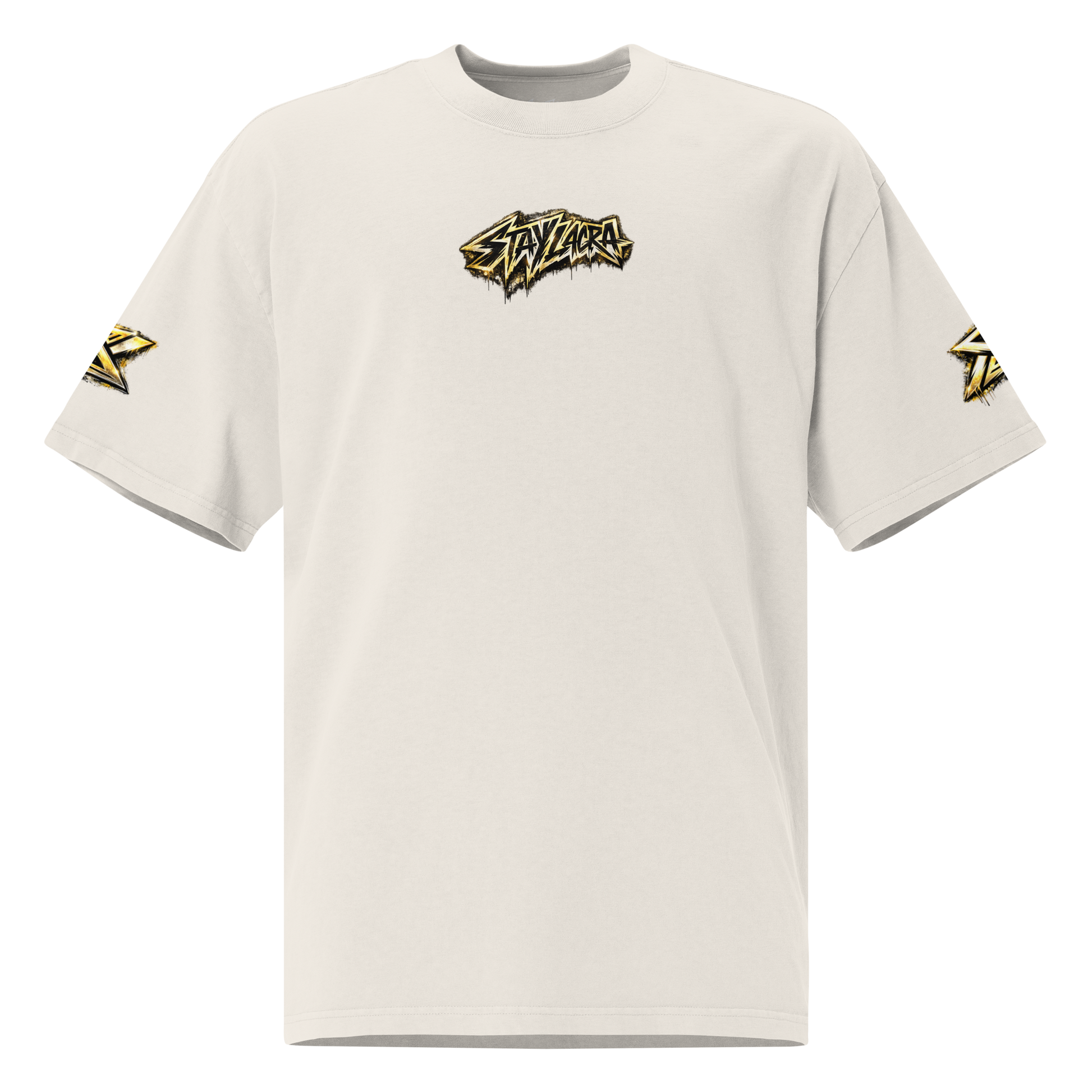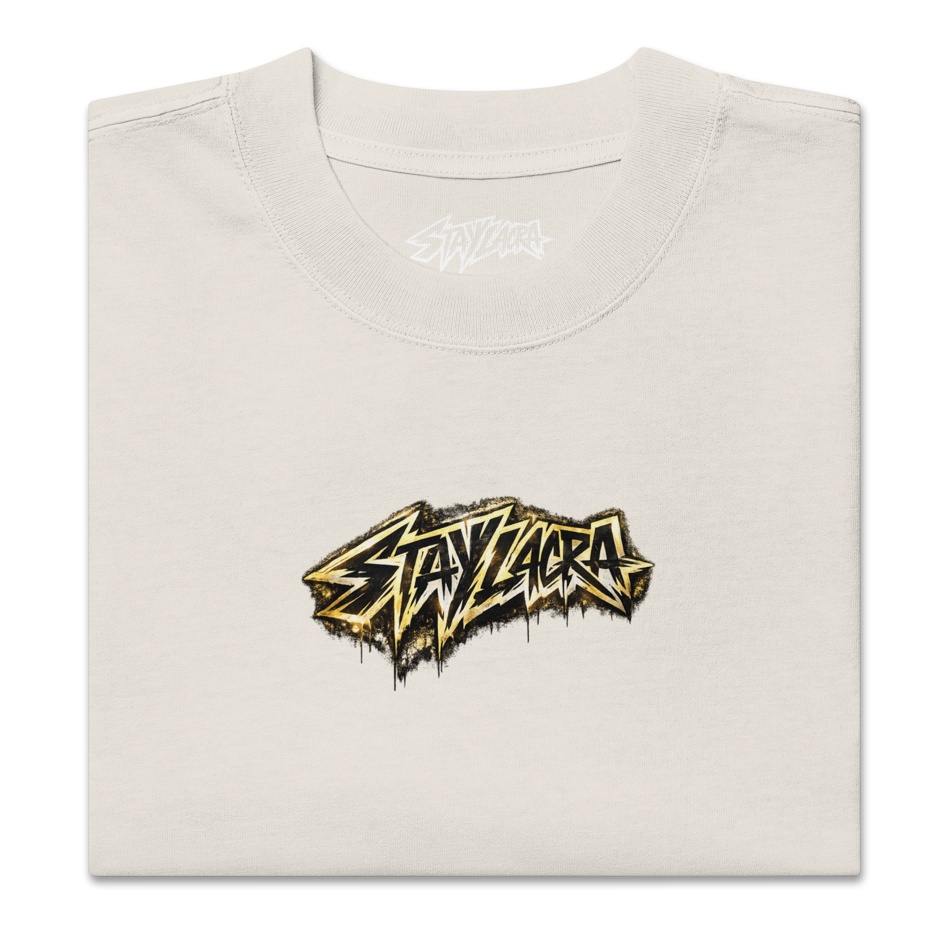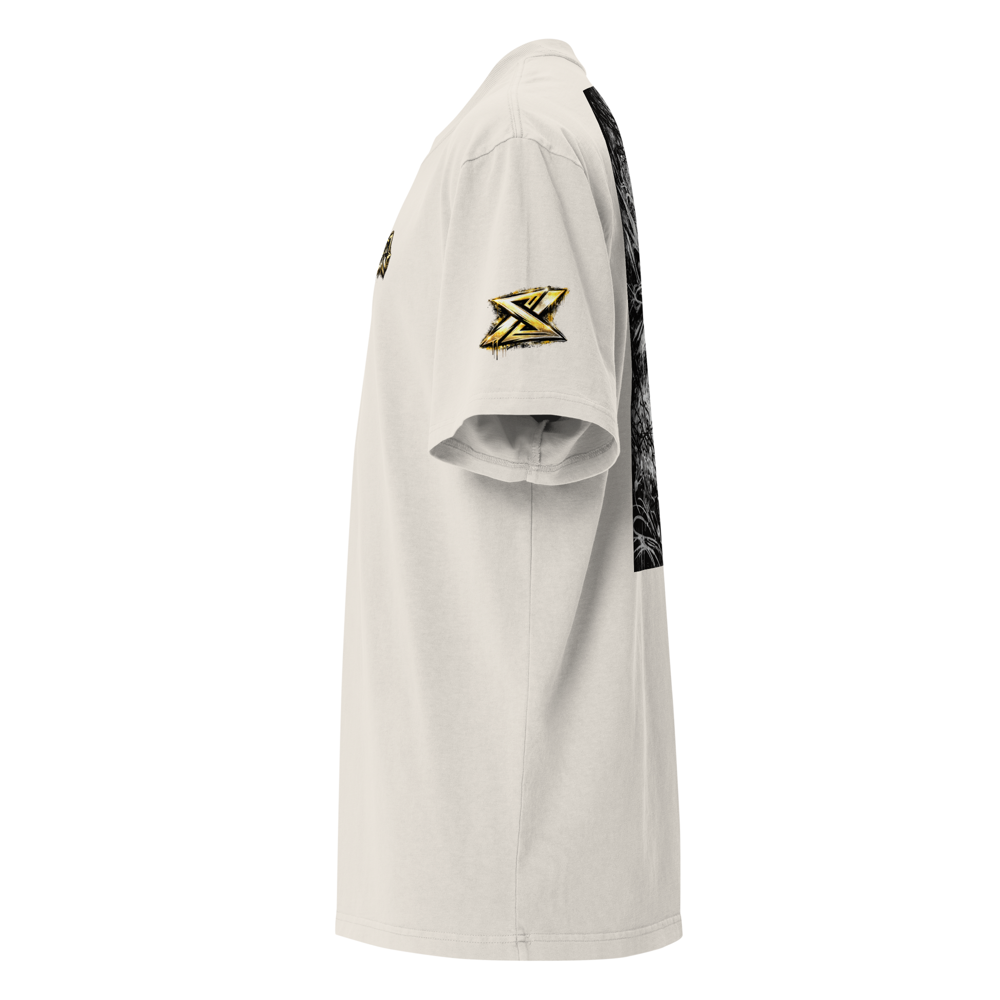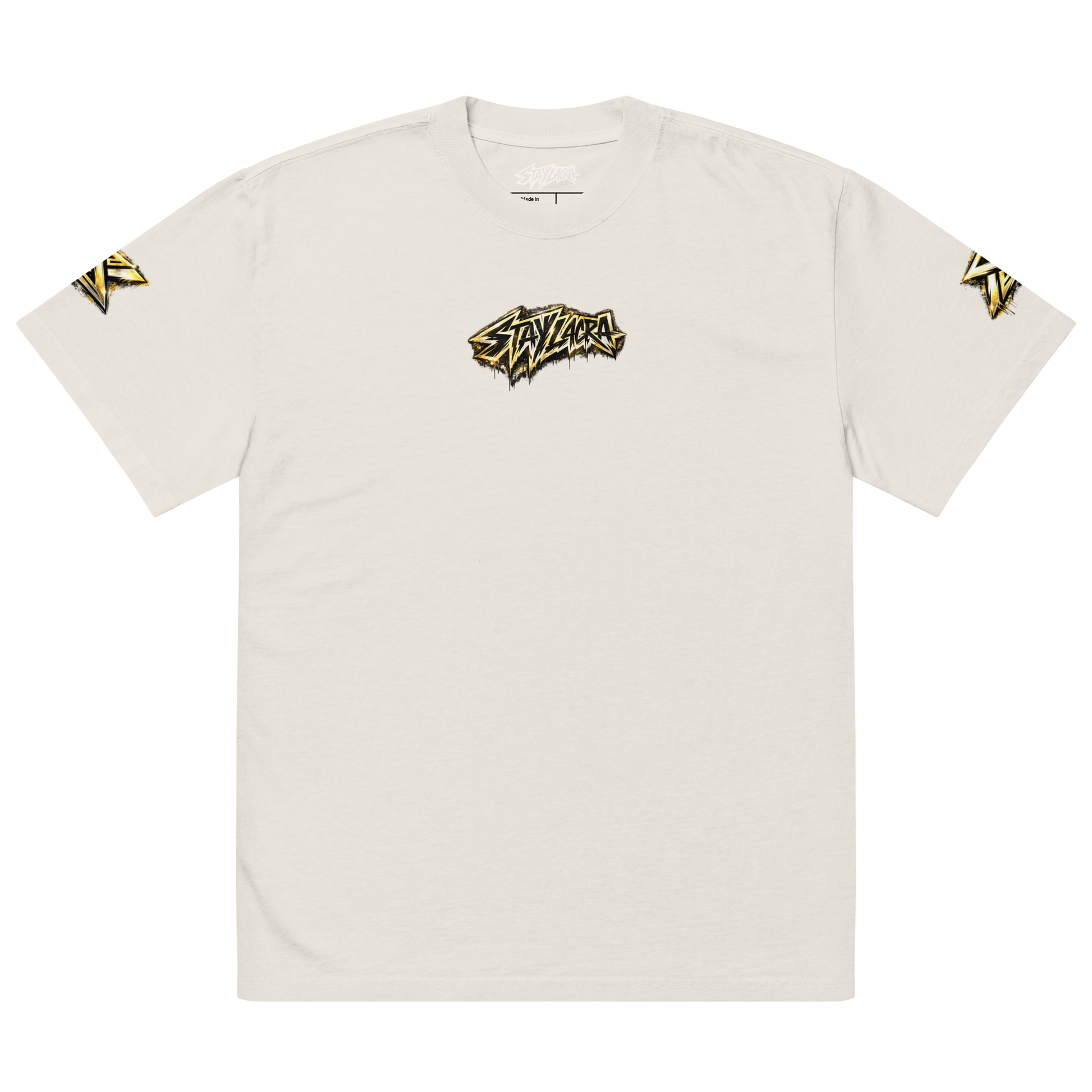 Built on a heavyweight oversized silhouette, this piece carries a layered graphic composition rooted in graffiti culture and symbolic authority. Gold meets light. Structure meets space.